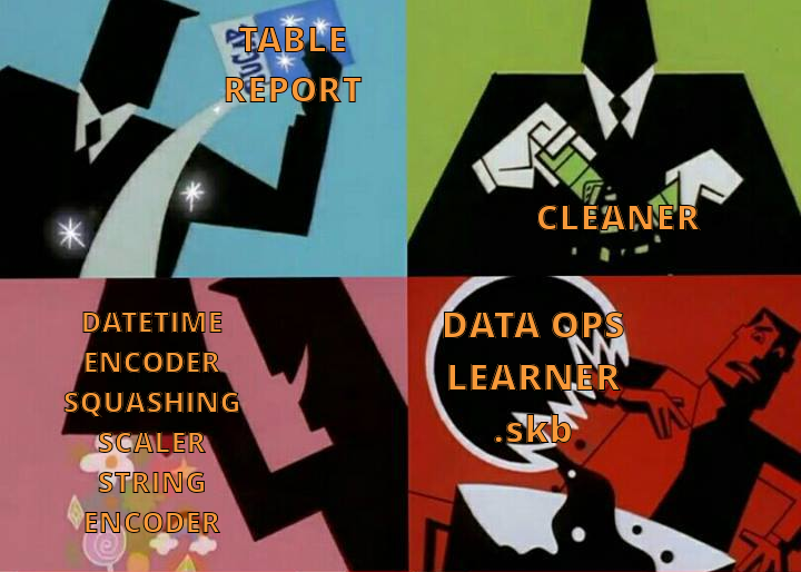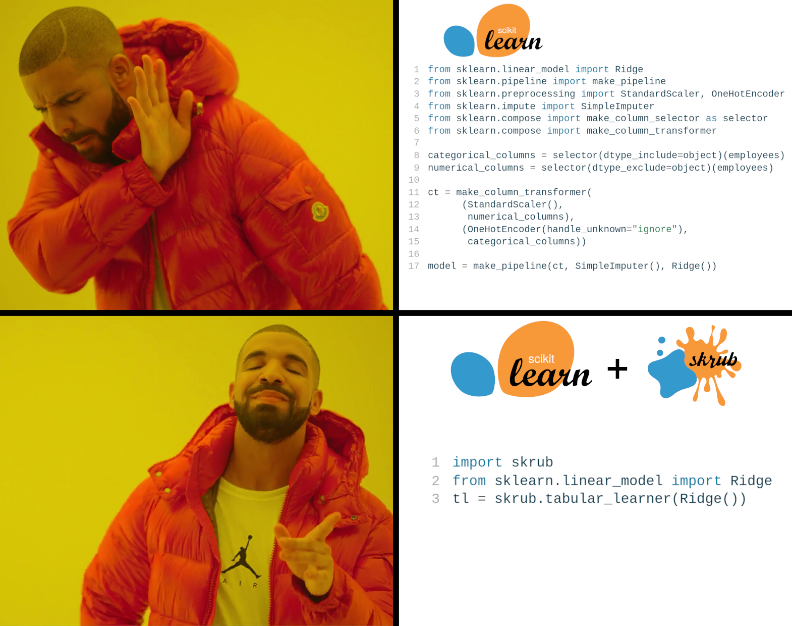 model = make_pipeline(ct, SimpleImputer(), Ridge())tabular_pipelineskrub.TableReportCleaner, ToDatetime …skrub.TableVectorizer,SquashingScaler, TextEncoder, StringEncoder…tabular_pipeline, sklearn.pipeline.make_pipeline …When a normal pipe is not enough…