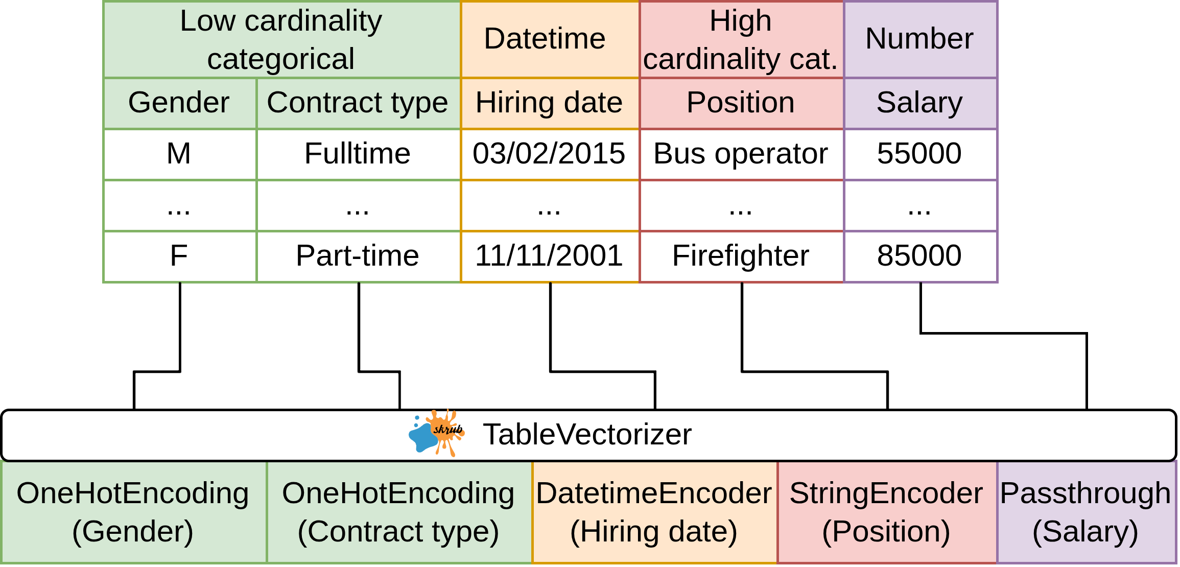OneHotEncoderskrub.StringEncoderskrub.TextEncoder and pretrained models from HuggingFace HubTableVectorizerTableVectorizerApplyToColsimport pandas as pd