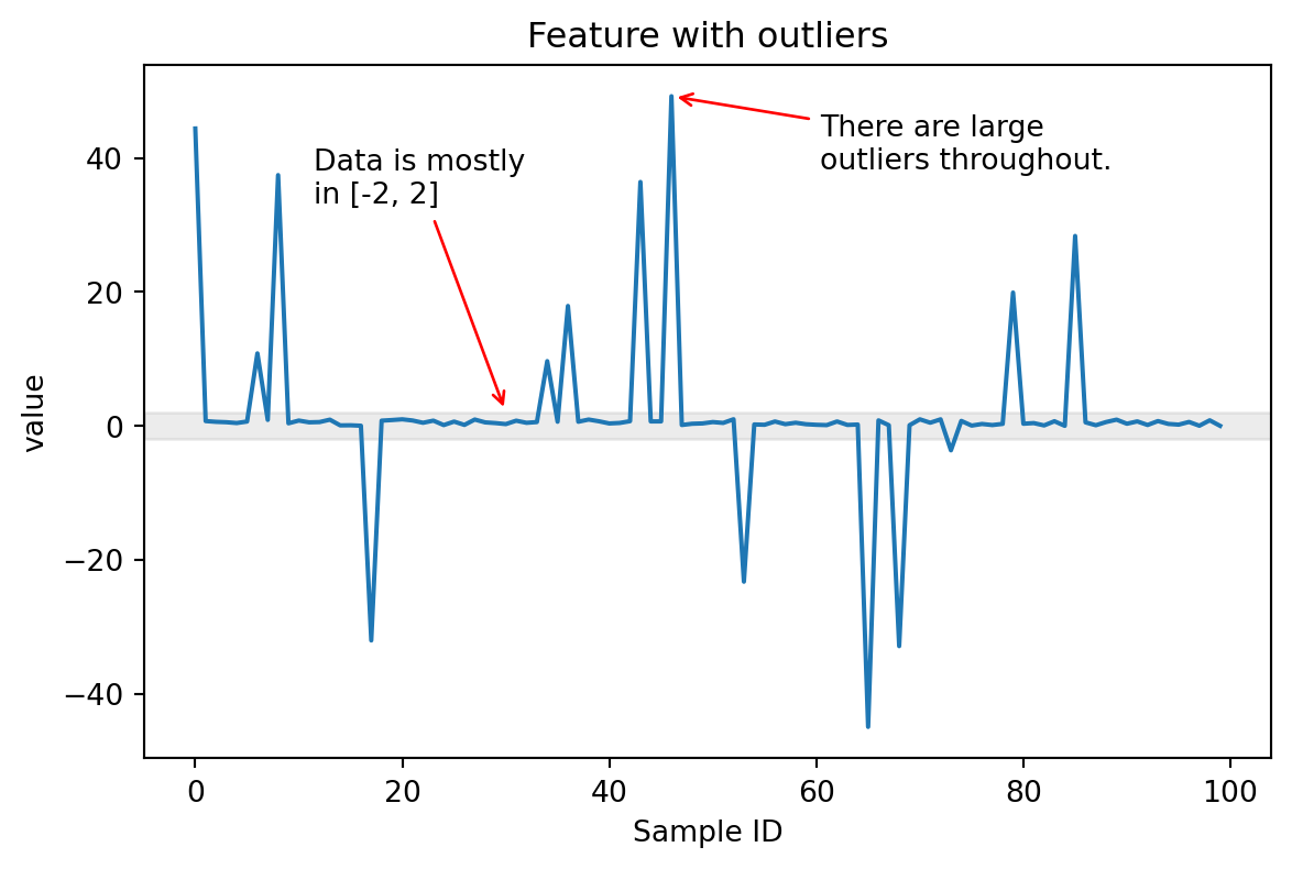 When dealing with numerical features that contain outliers (including infinite values), standard scaling methods can be problematic. Outliers can dramatically affect the centering and scaling of the entire dataset, causing the scaled inliers to be compressed into a narrow range.
